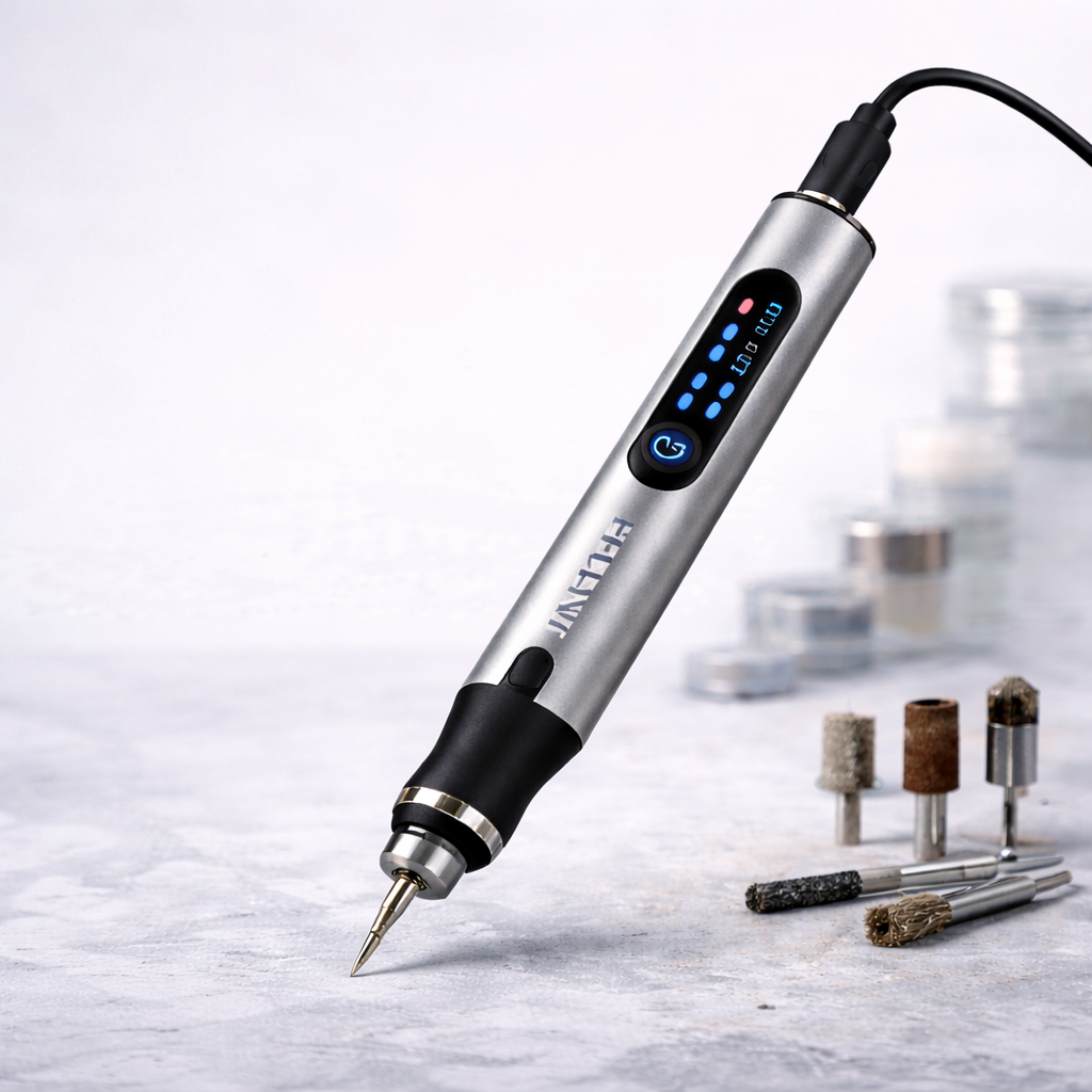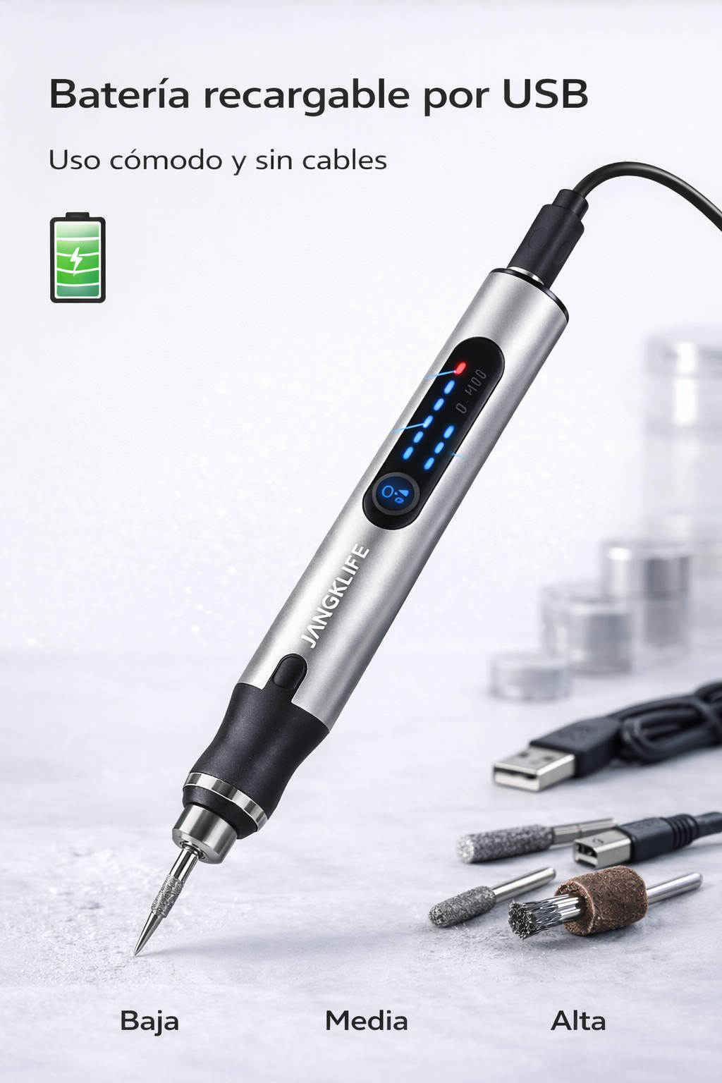 Graba, lija, corta y pule con total control gracias a este mini taladro inalámbrico USB. Sus 3 velocidades ajustables y su diseño tipo pluma te permiten trabajar vidrio, metal o joyería con acabados limpios y precisos, sin cables y donde quieras. ⚙️✨
