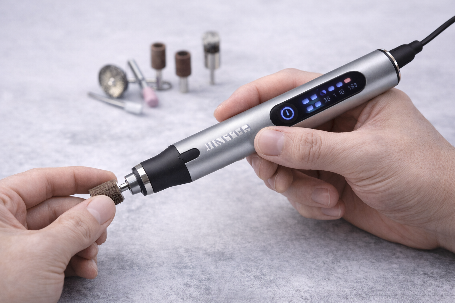 Kit de herramientas rotativas inalámbricas con diseño tipo pluma, ideal para trabajos de precisión en carpintería, bricolaje, joyería y manualidades.